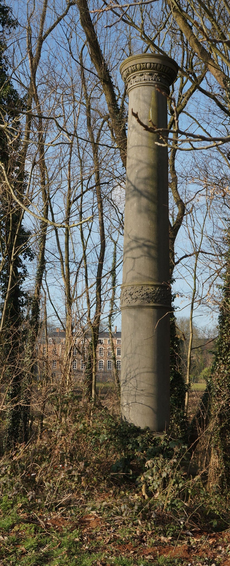 Maar misschien is de zuil een vervanging van een ouder exemplaar of van een oude eik die op die plaats stond. De zuil is versierd met een eikenbladkrans en eikels. De eierlijst (ei-en-pijl motief) op het kapiteel is een heidens symbool voor leven en dood en het eikenloof toont ons de levensversterkende krachten van de eik. Voor de Druïden waren de heilige eikenbomen heel belangrijk. Die zuil kan daar nog aan herinneren. De bij het kasteel teruggevonden heiligdom had duidelijk (heilige) bomen geïntegreerd in de gebouwen.